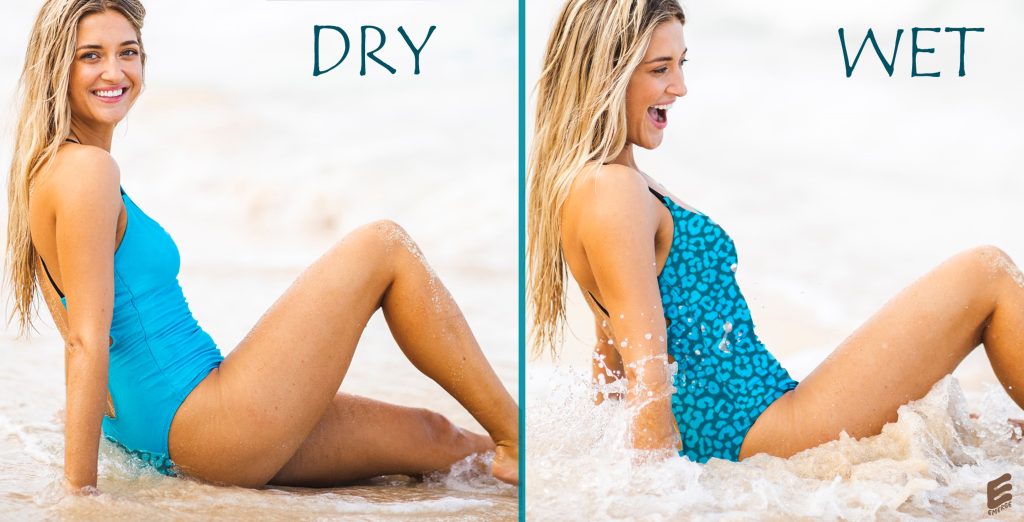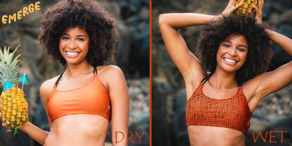 driSTREAM™ technology is used to create Emerge™, a unique swimwear fabric that reveals a pattern only when wet.